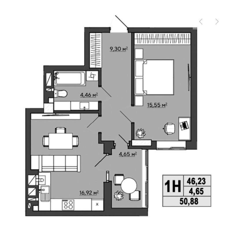 Зручне планування: кухня -17 м2,балкон 4,6м2,кімната - 15,5м2,санвузол та ванна суміжні.