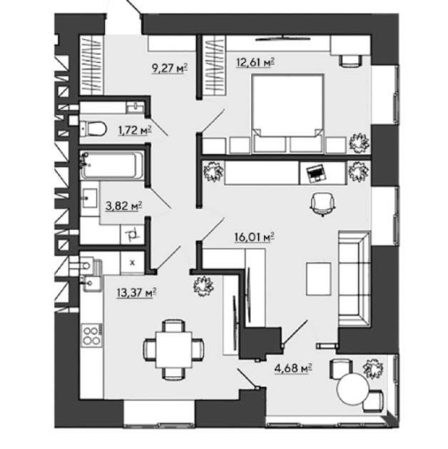 Площа 66,5 м2,кухня 14 м2,балкон 4,5м2, кімната - 16 м2, кімната 13м2,вання 4м2, санвузол 2м2.