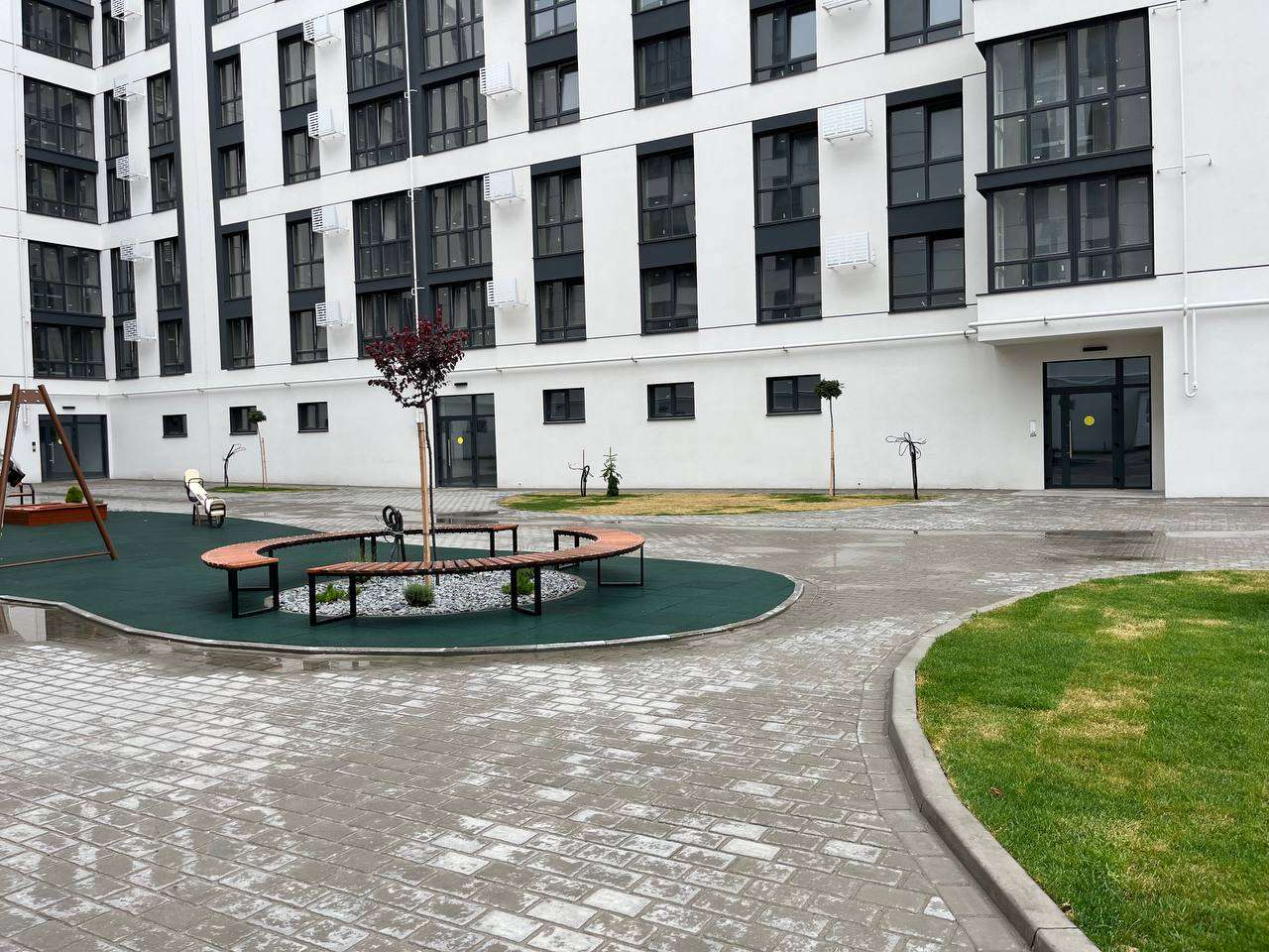 Впорядкована прибудинкова територія,сучасні ігрові дитячі майданчики.
